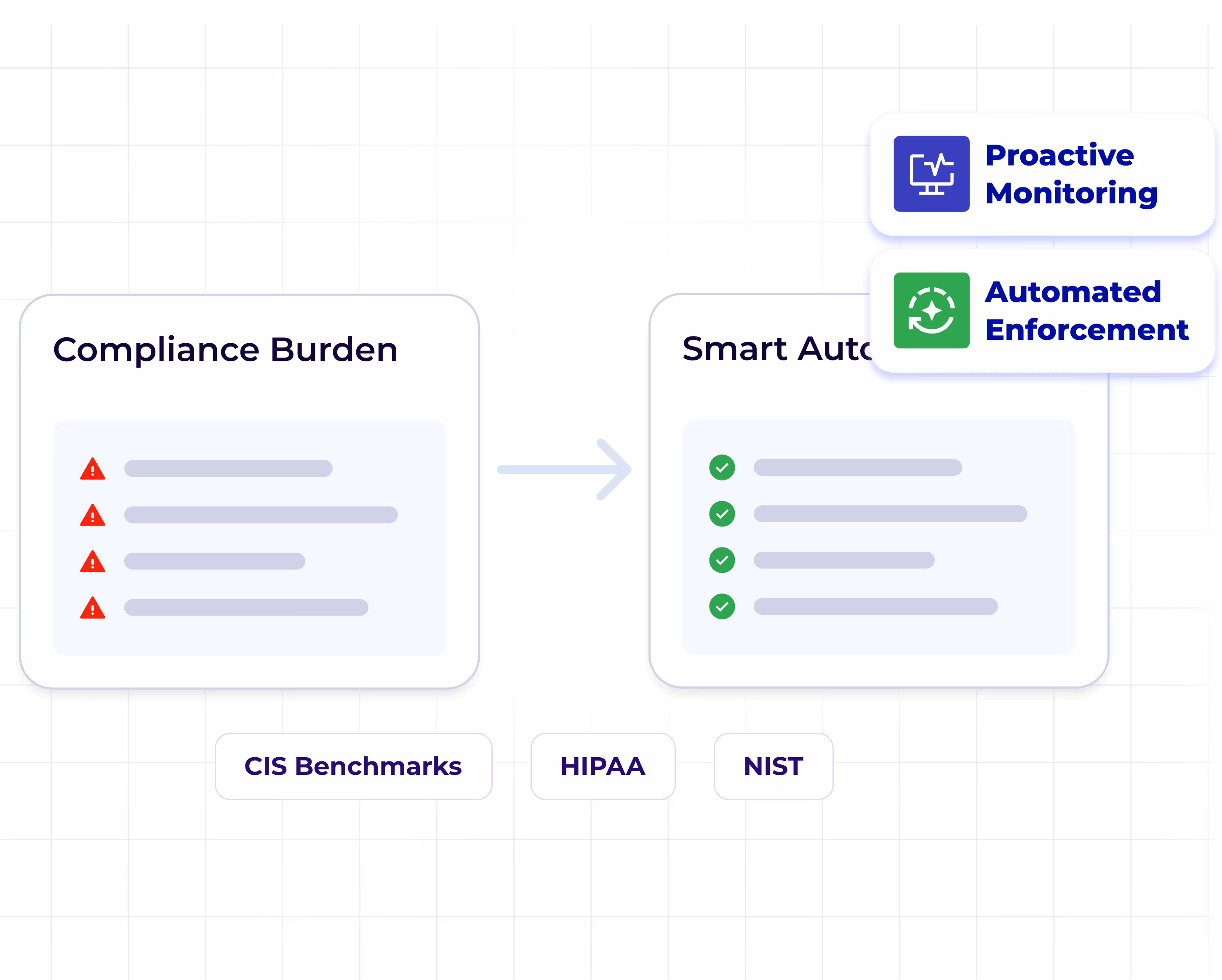 Organizations in regulated industries face challenges maintaining compliance across complex infrastructures due to fragmented tools, manual processes, and evolving regulations. Sicura automates compliance monitoring and remediation, reducing operational inefficiencies and mitigating security risks.